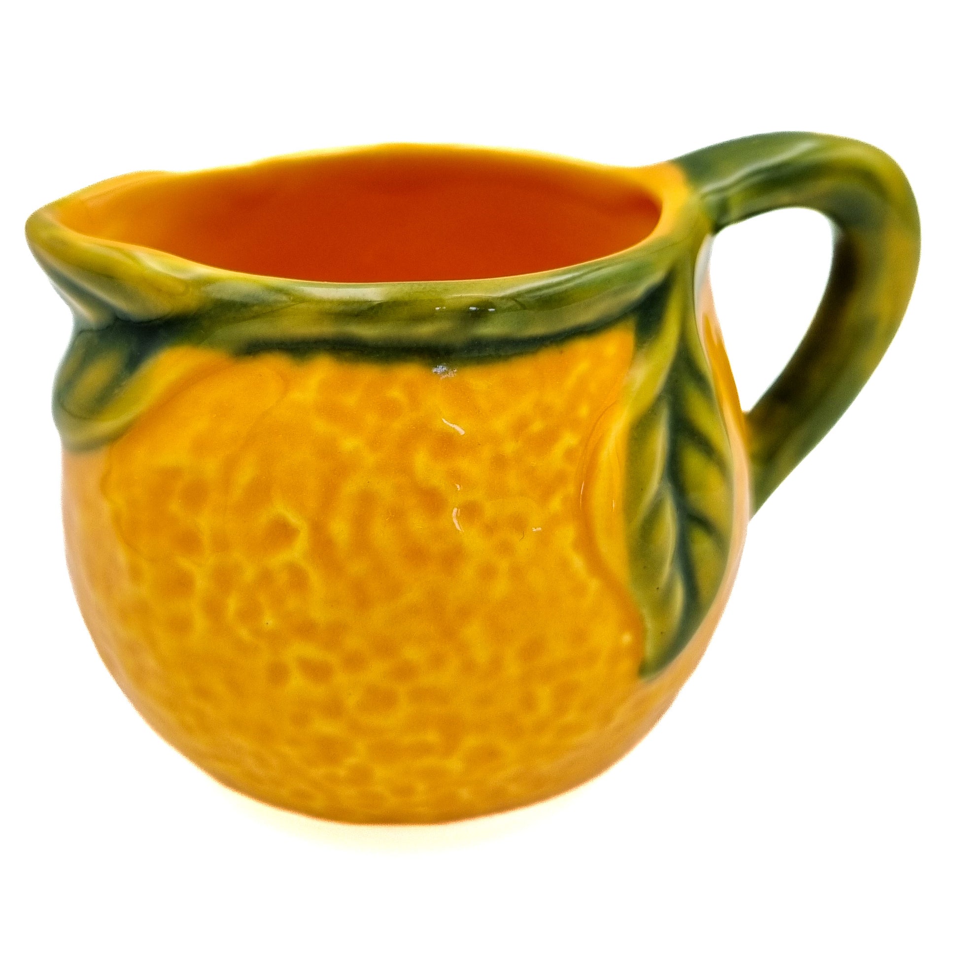 En grädd/mjölkkanna i form av en naturtrogen apelsin.