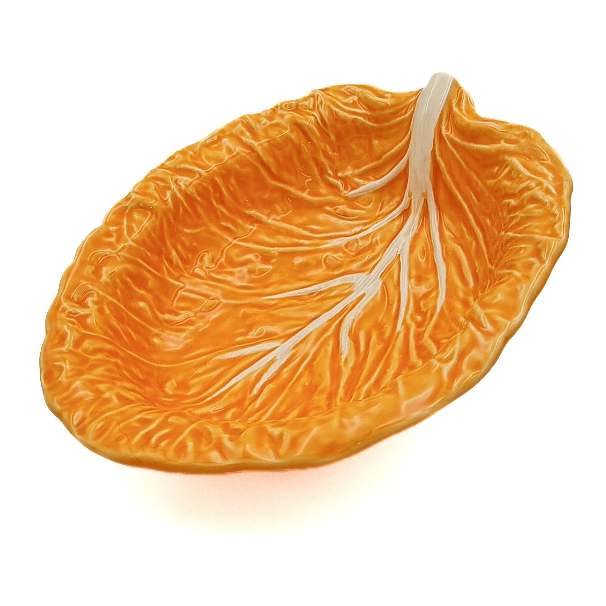 Keramik fat i en läcker orange färg i form av ett kålblad.