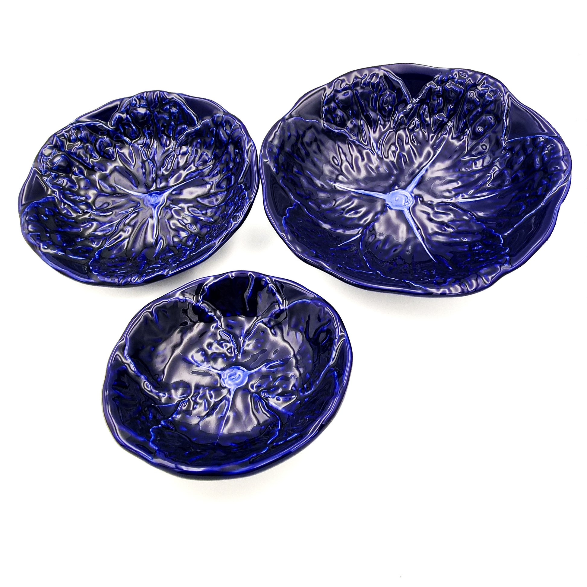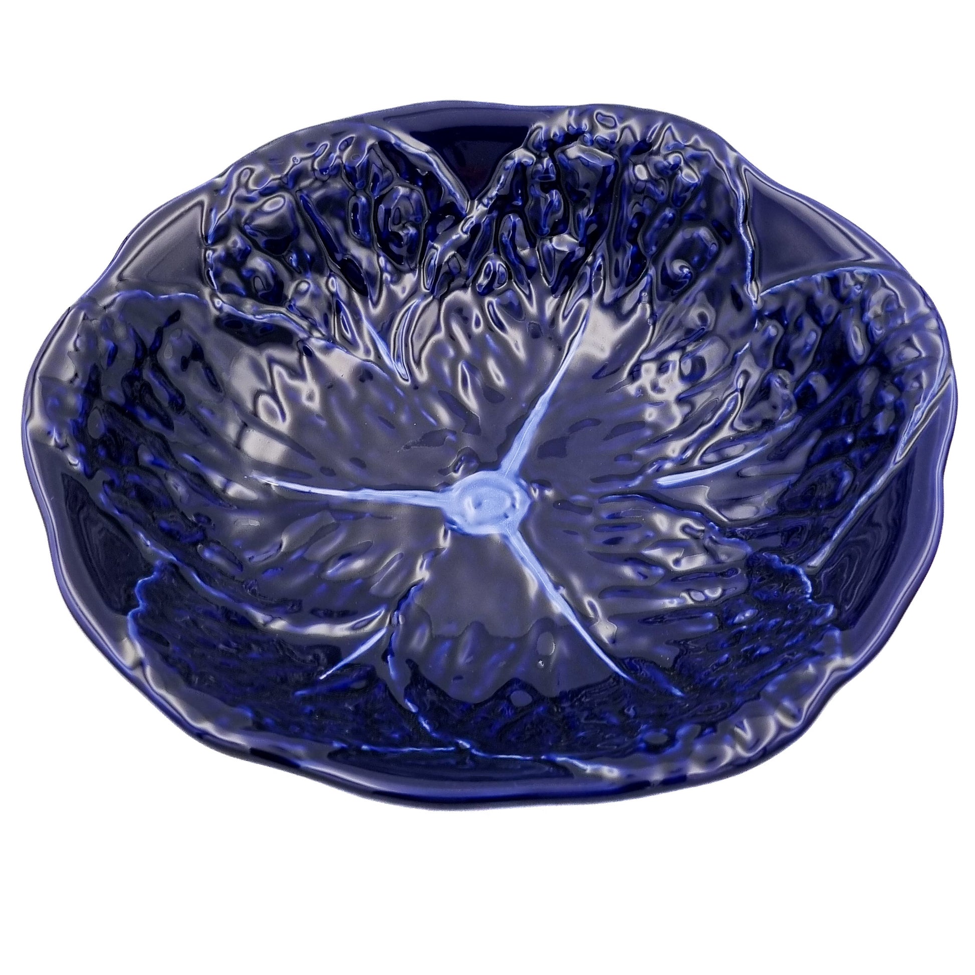 En uppläggningsskål i form av ett kålblad i färgstark kobolt.